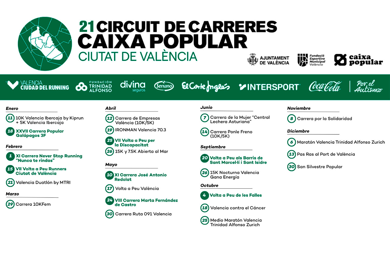 València Ciutat del Running torna a preparar un complet calendari de carreres per a oferir a tots els corredors locals i els milers de visitants que rep la ciutat del running per esta raó cada any. La ciutat acollirà més d'una trentena de carreres d'al llarg de tot l'any.